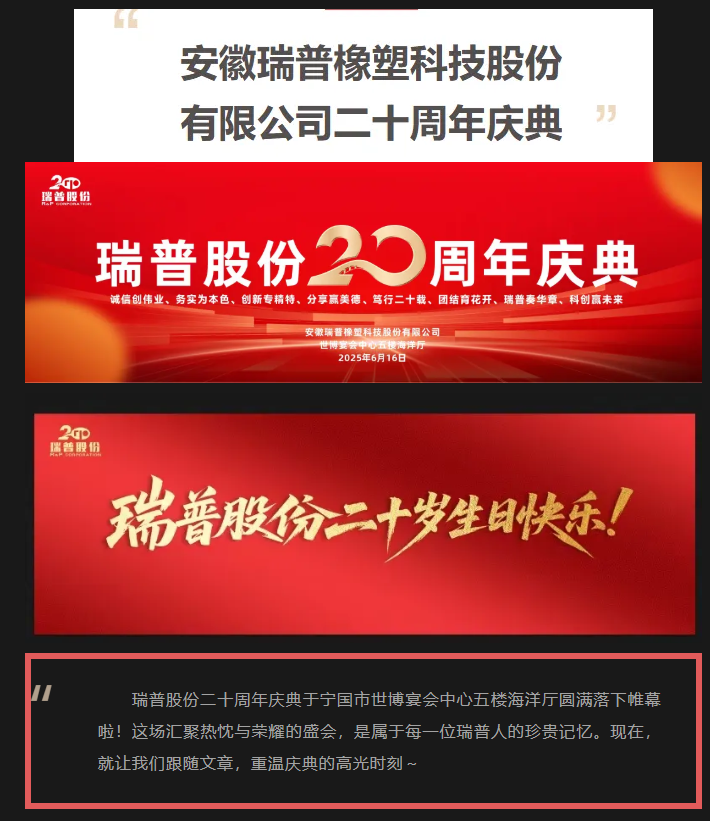 二十載櫛風(fēng)沐雨,二十載砥礪前行。值此安徽瑞普橡塑科技股份有限公司成立二十周年之際,我們滿懷感恩與喜悅,誠邀您撥冗出席二十周年慶典活動(dòng),共同見證這一榮耀時(shí)刻,共敘情誼,共謀未來!